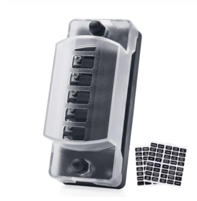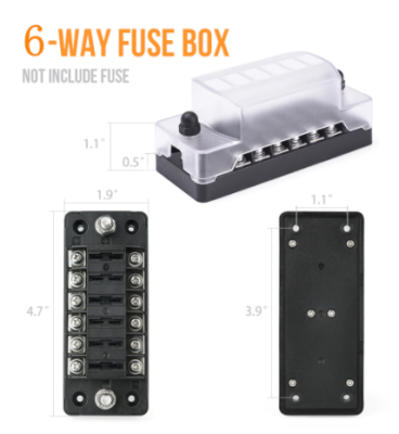 DC fuse board - 6 way COMPACT. Incoming Negative and Positive M5 studs, neg return bus bars. All terminations for ring terminals. 12 - 32 volt. LED 'fuse failure' indicator for each circuit. Supplied with labels and cover. 50w x 120l x 28h (mm)