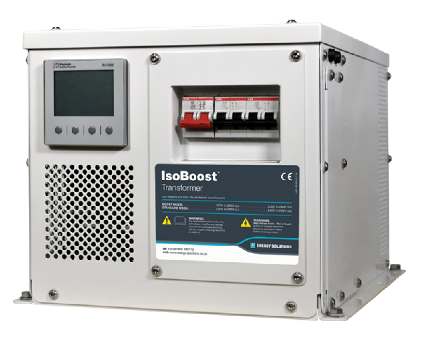 The Energy Solutions IsoBoost transformer provides a cost effective and reliable solution to isolate and manage a shore line. It provides all of the features of a normal isolation transformer, as well as providing a boost function to manage the volt drop on heavily loaded shore lines, or to cope with a 208V (phase to phase) supply. On startup, the isolation transformer automatically soft starts the transformer to prevent inrush from tripping the supply breaker. If the voltage is in range, it operates in 1:1 mode, so that the output voltage matches the input voltage. If the supply voltage drops below 215V, it automatically switches into boost mode, effectively raising the output voltage by around 10%. If the supply voltage recovers, the IsoBoost automatically switches back to 1:1 operation.