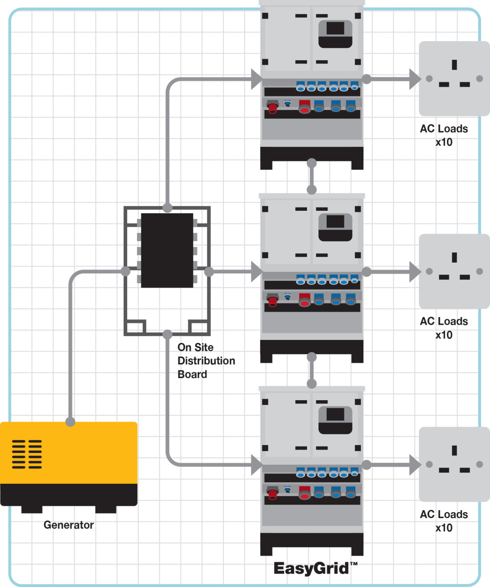 On sites that have one large generator as a central power hub, multiple EasyGrid units (up to 10) can be set up via an on site distribution board to work in synchronisation and deliver power to separate areas.
