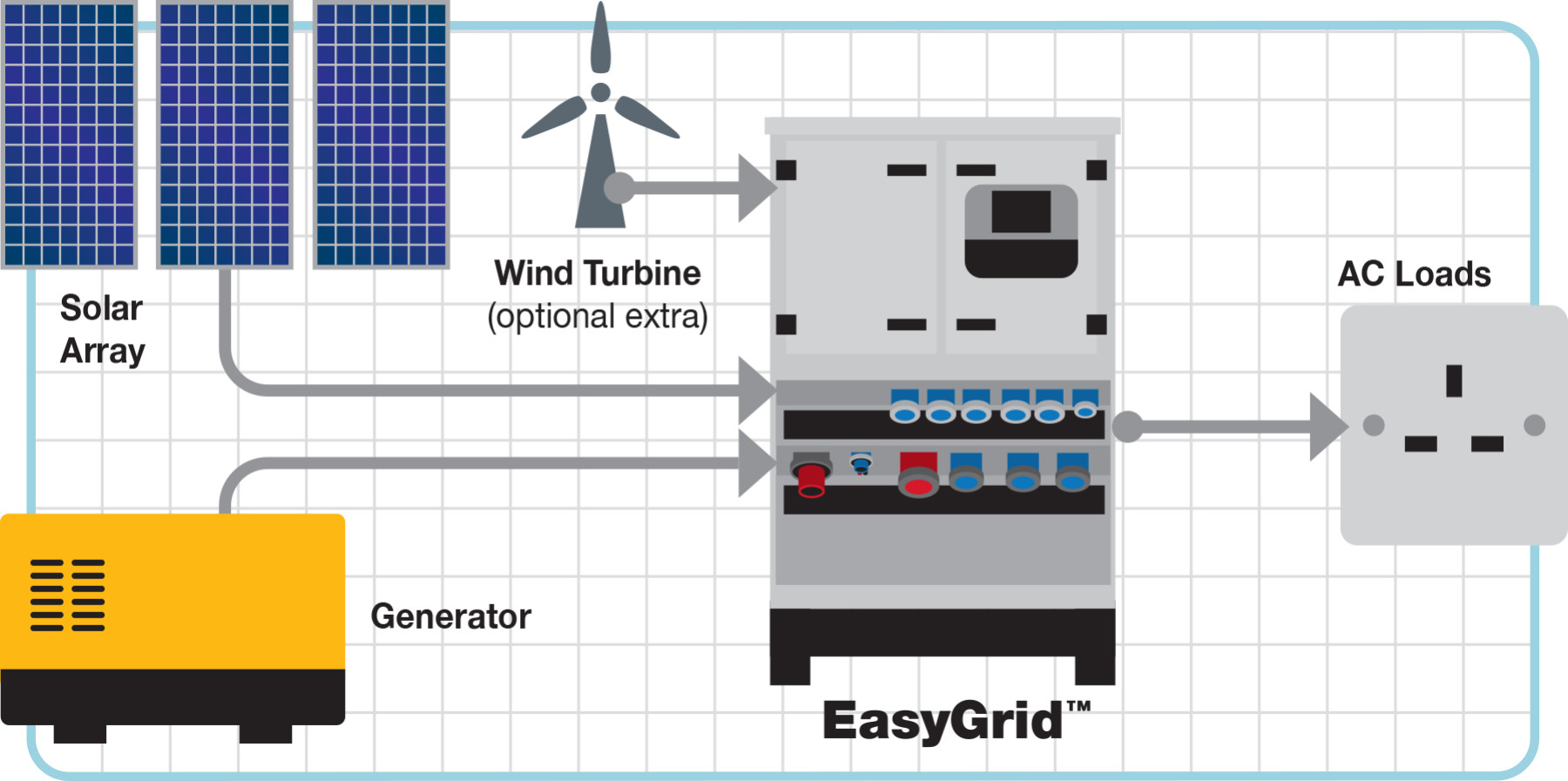 The EasyGrid unit connects to a generator, and renewables if available, storing energy in its battery bank until needed. When power requirements are lower – silent, emission-free electricity is supplied from the battery bank, allowing more cost-efficient use of the generator. The generator now only needs to run when the loads are high or the batteries need to be topped up.