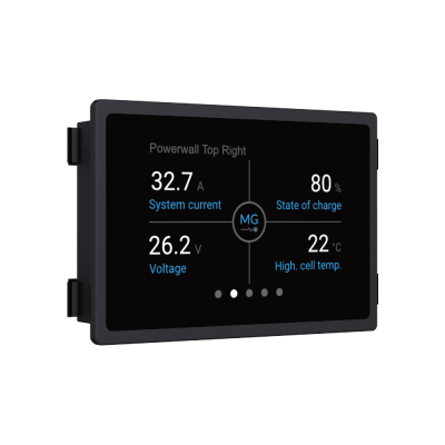 The MG Energy Monitor is a high resolution touchscreen display. It shows all important battery parameters at a glance. This results in easy control and monitoring of your MG battery system. It provides an overview of the battery system status and gives insight into the energy flows. The compact dimensions and high IP-rating make it suitable for a wide range of applications. It is connected to the BMS CAN-Bus interface of the MG Master LV or HV.