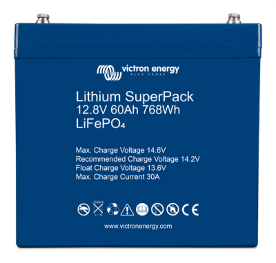 Victron lithium ion SUPERPACK battery with integrated BMS and safety switch. 60Ah 12.8V 7.65 kg (BAT512060705) 0.768 kWh nominal capacity - cell type Lithium-iron-phosphate (LiFePo4 or LFP) - 229x138x213mm (LxWxH)