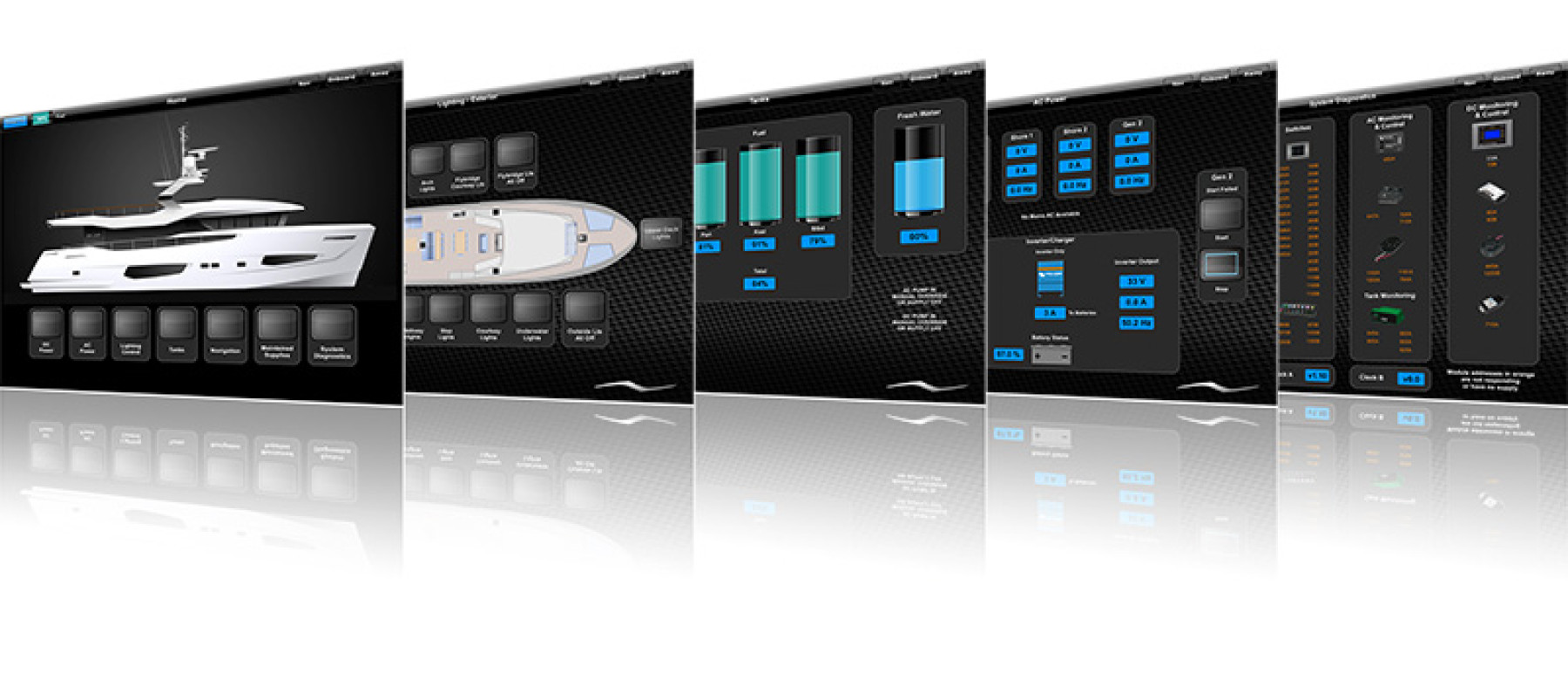 The system has a screen in the helm and also an iPad interface, allowing boat owners to monitor and control the system from anywhere on the boat. Functions that are controlled through the E-Plex system include generators, AC Supply monitoring, battery monitoring, water/fuel tank monitoring, water pump controls and bilge pump monitoring as well as all lighting.