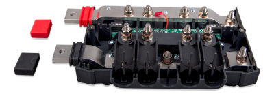 The Lynx Distributor contains a positive and a negative busbar. The positive busbar has four fuse-protected connections with fuse monitoring. The negative busbar has four connections and a ground connection. It is part of the Lynx Distribution system and is available in two versions, with M8 or M10 busbar. Note that M10 refers to the busbar connection joints where the modules are connected to each other. The fuse and cable connections are always M8.