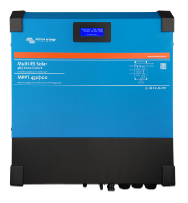 The Multi RS Solar 48/6000 is a 48V 6kVA Inverter/Charger with two independent 3kWp PV 450V MPPT tracker inputs for 6kWp PV total.